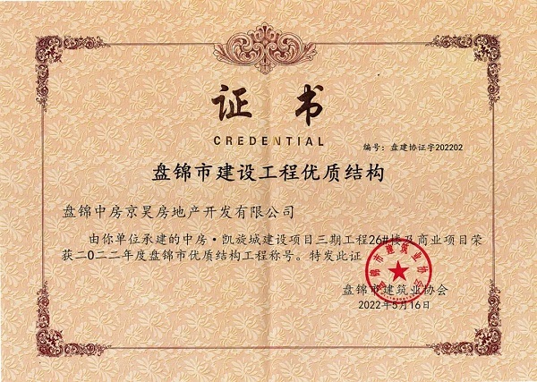 近日,由中房集团盘锦公司负责开发建设的中交凯旋城项目三期工程26#楼及商业项目荣获“二〇二二年度盘锦市优质结构工程”荣誉称号。